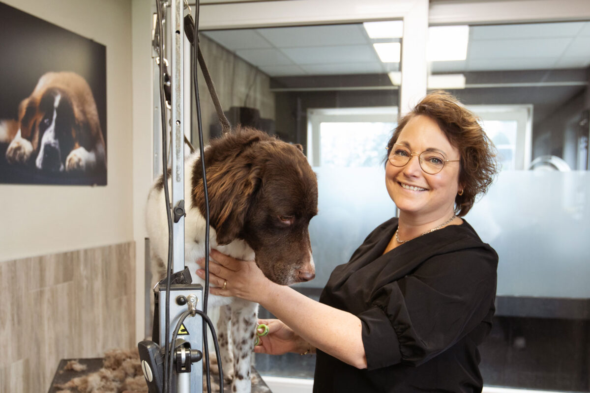 “In de salon hoorde ik vaak verhalen over gedragsproblemen bij honden. Vaak wist ik precies waar het misging, maar het goed uitleggen, vond ik soms lastig. Dat bracht me ertoe de opleiding tot kynologisch instructeur bij O&O te volgen. Die opleiding was leerzaam, maar voor mijn gevoel nog niet compleet. Daarom besloot ik verder te leren bij Anniek Winters, die werkte volgens de Cesar Millan-methode. Ik voelde mij als een vis in het water en Anniek werd overladen met mijn enthousiasme. De methode sloot zo goed aan bij mijn gevoel en wijze van werken dat ik zelfs een eigen trainingsriem ben gaan ontwikkelen, die perfect past binnen deze werkwijze. Deze riem is verkrijgbaar in onze salon. Om mijn kennis verder te verdiepen, volgde ik daarna nog een cursus bij Martin Gaus. Juist omdat deze twee experts volgens de media vaak van mening verschillen, wilde ik zelf ervaren wat de overeenkomsten waren. En die bleken groot. Bij beide staat het welzijn van de hond centraal. Het begrijpen van de hond en de samenwerking tussen hond en mens. Vandaar ook ons logo, dit kan op twee manieren gelezen worden, ‘Hûn & Minsk’ (hond en mens) en ‘hondenmens’, want uiteindelijk worden die twee samen één.”
